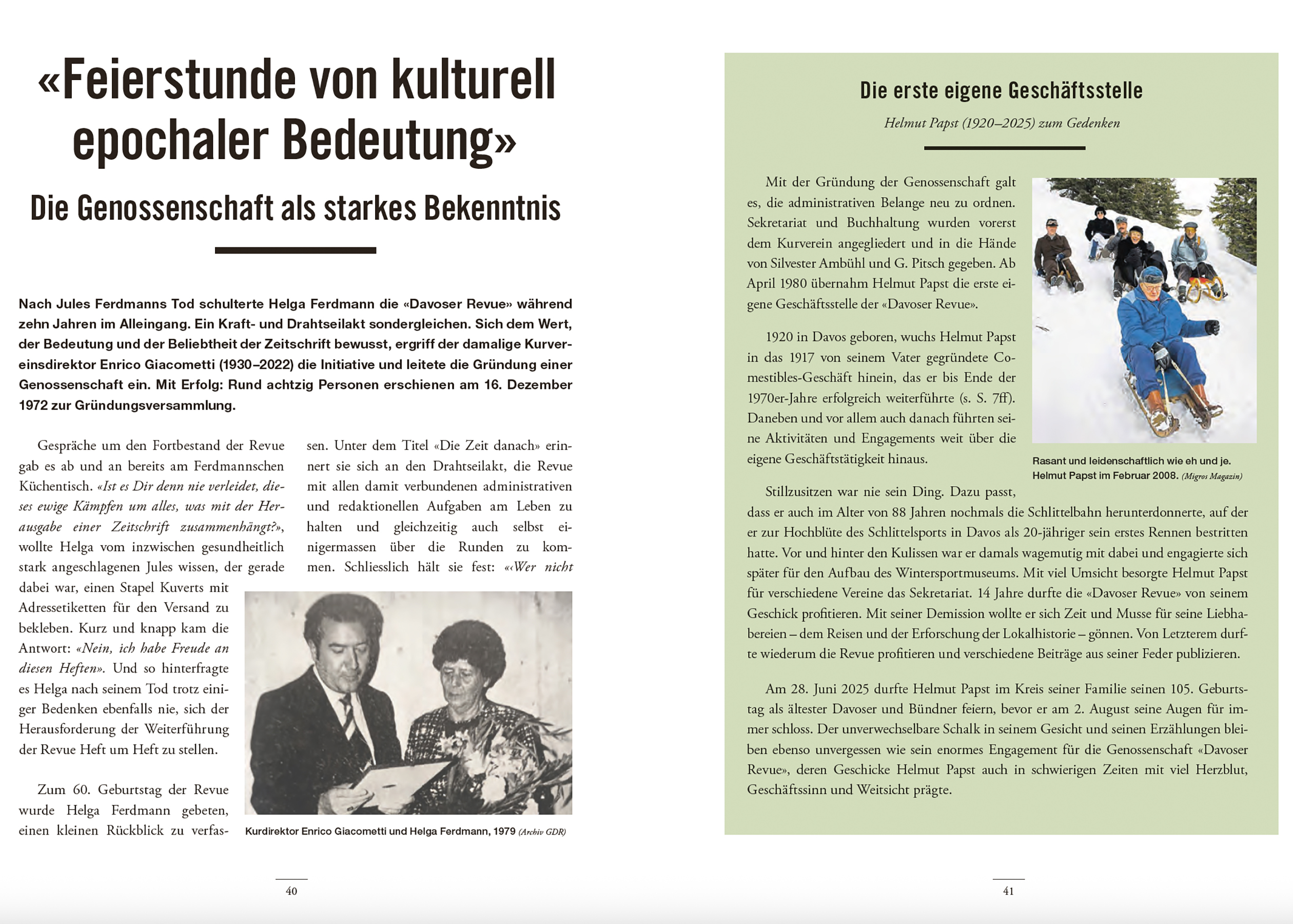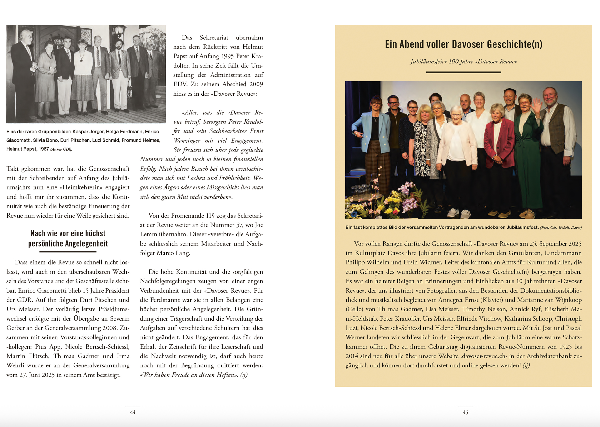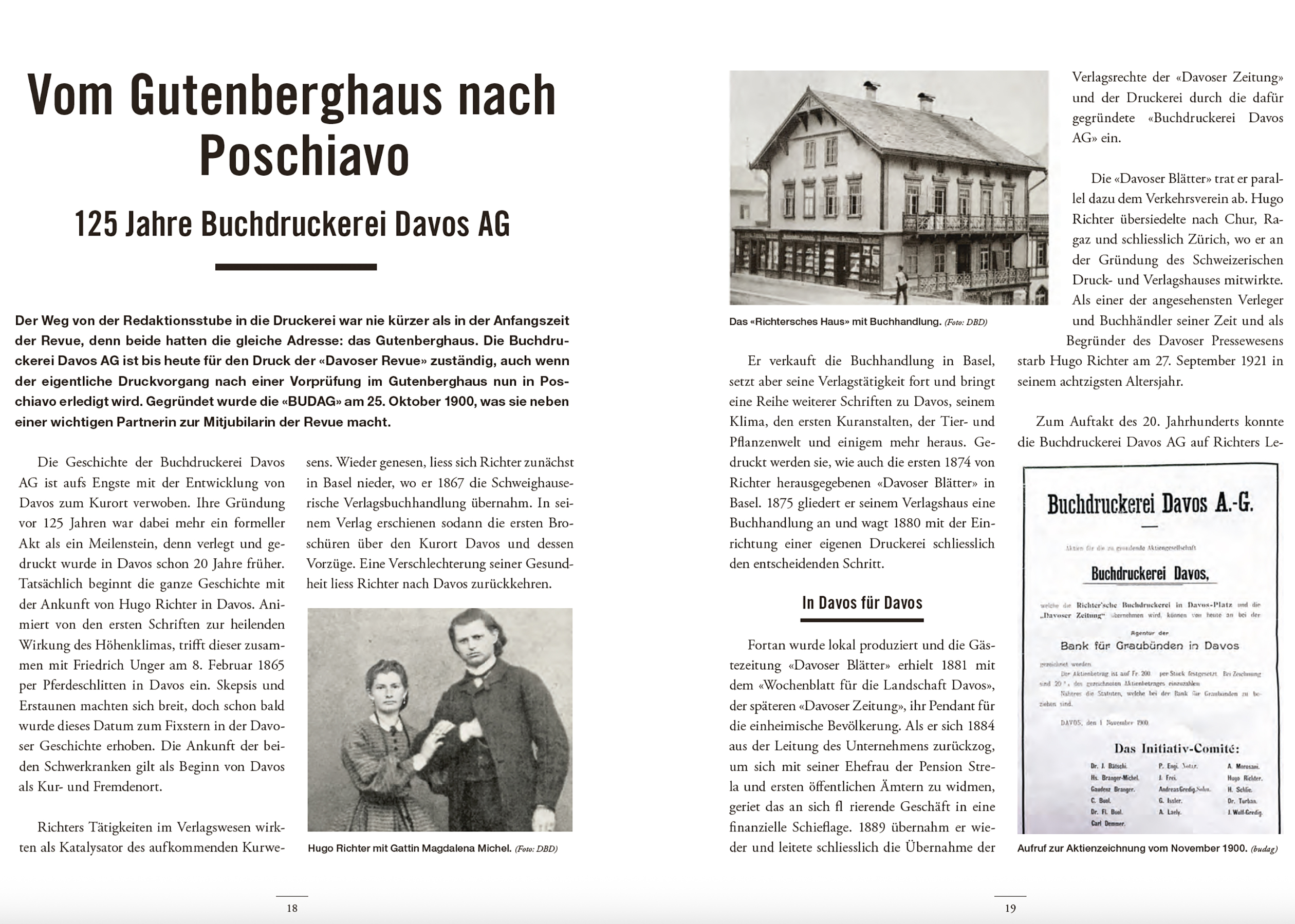 Seit hundert Jahren verfügt Davos über ein Juwel im rauschenden Blätterwald – die «Davoser Revue». 1925 von Jules Ferdmann gegründet, verfolgt und dokumentiert die kulturhistorische Zeitschrift die Besonderheiten und Entwicklungen von Davos. Ausgabe um Ausgabe hat sich über die Jahrzehnte ein unglaublich vielfältiger und reichhaltiger Wissensschatz angehäuft. Wer auch immer sich für Davos interessiert oder zu Davos forscht, kommt an der Revue nicht vorbei und findet in ihr eine ebenso spannende wie verlässliche Begleiterin.